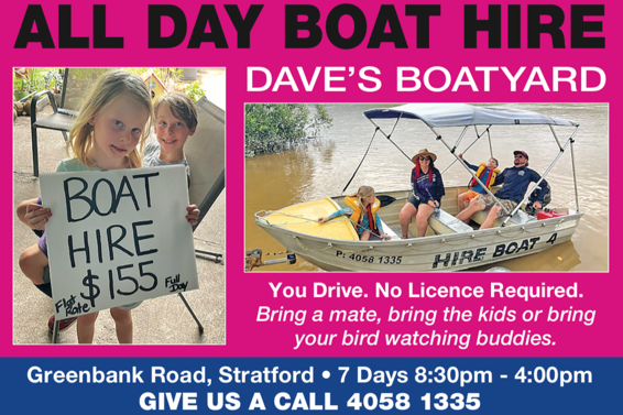 So come and hire one of our Hire Boats from Dave’s Boatyard and get out on the water today. $155 Full day hire. 8.30am to 4.00pm - 7 days. Phone: 40581335 to make your booking.